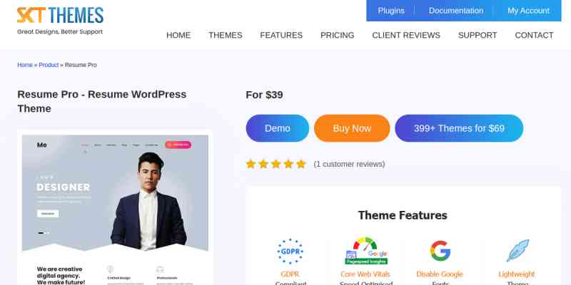 SKT Resume is a responsive multipurpose WordPress theme which can be used for multiple purposes and industries. So photo gallery, portfolio, or any business, blogging etc can be done. It has the ability to change colour of links and certain elements so that it suits the colour of your logo. Also the theme comprises of several blocks on the homepage making it a complete theme so that one may add anything he wants on the home page. Also it uses a very easy to use theme options whereby one can easily set up social icons and other elements with ease and without having any knowledge of HTML. SKT Resume is 100% responsive pixel perfect WordPress theme which comprises of different page templates and widgets to help able to edit and handle the theme easily. Can be used for any kind of business, blogging, photo, or portfolio purposes. Easy to set up menu using Appearance menus. Compatible with all major browsers and iPhone and iPad friendly as well. Comes with a beautiful parallax slider. One can also set up this theme as a store as its compatible with WooCommerce and also other popular plugins like Contact form 7. It is translation ready and can be translated for any language. Also it has custom header as well as custom background. Check demo at: http://sktthemesdemo.net/resume/