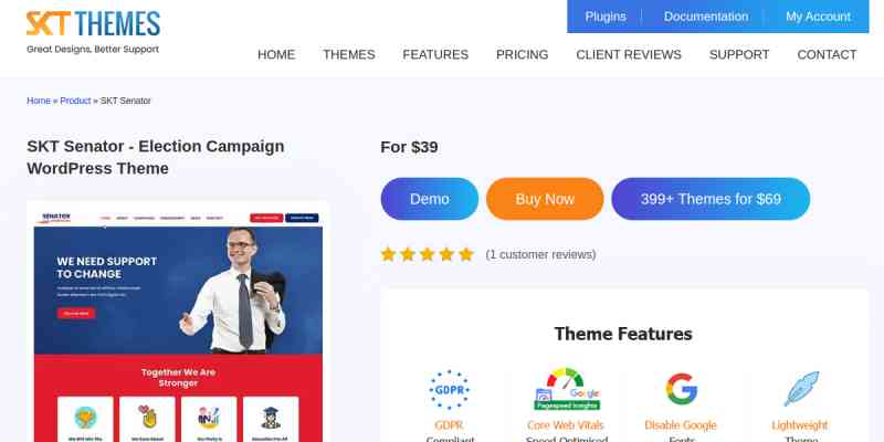Senator is a political WordPress theme for campaigns, fundraisers, donation, events, voting and other types of such websites. Demo: https://sktperfectdemo.com/demos/senator/